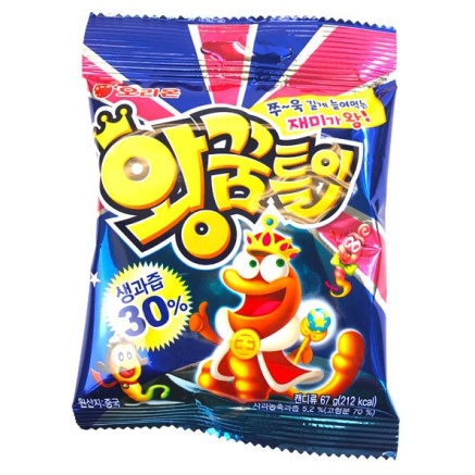 Tangy and sweet gummy worms from Crown with a bunch of small worms and one big worm inside. The king worm has a cola flavor to it, and is bigger than every other worm, making him the real King Jelly!
