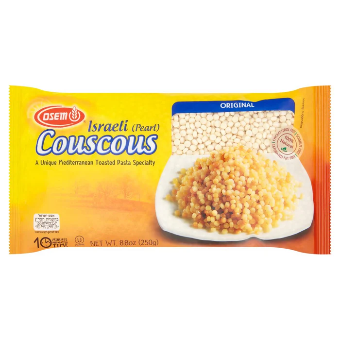 Is a very versatile pasta uniquely toasted in an open flame oven, which allows it to absorb liquids while remaining “al-dente”. It makes a perfect side dish to meat, poultry or fish. It is also delicious as a main course mixed with vegetables or with your favorite pasta sauce. Osem Israeli (Pearl) Couscous is also great as a cold pasta salad. 10 minutes preparation time, All natural ingredients, 100% natural, Cholesterol, sodium and saturated fat free, No preservatives, No food coloring.
