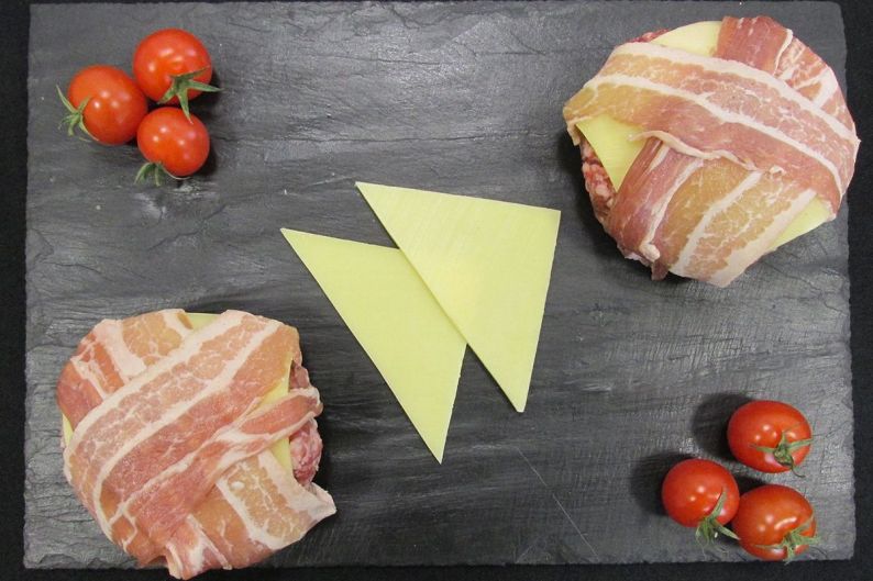 Produit à base de chair à saucisse à l’emmental, d’emmental et de poitrine fumée