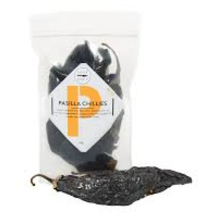 Pasilla chillies are a dark green, dried chilaca pepper used in Latin American and Spanish cuisine. Literally translating as ‘little raisin’, mild pasilla has grape-like, liquorice flavours and a medium-low hotness, ranking just 1,000-2,000 on the Scoville Scale of chilli heat.