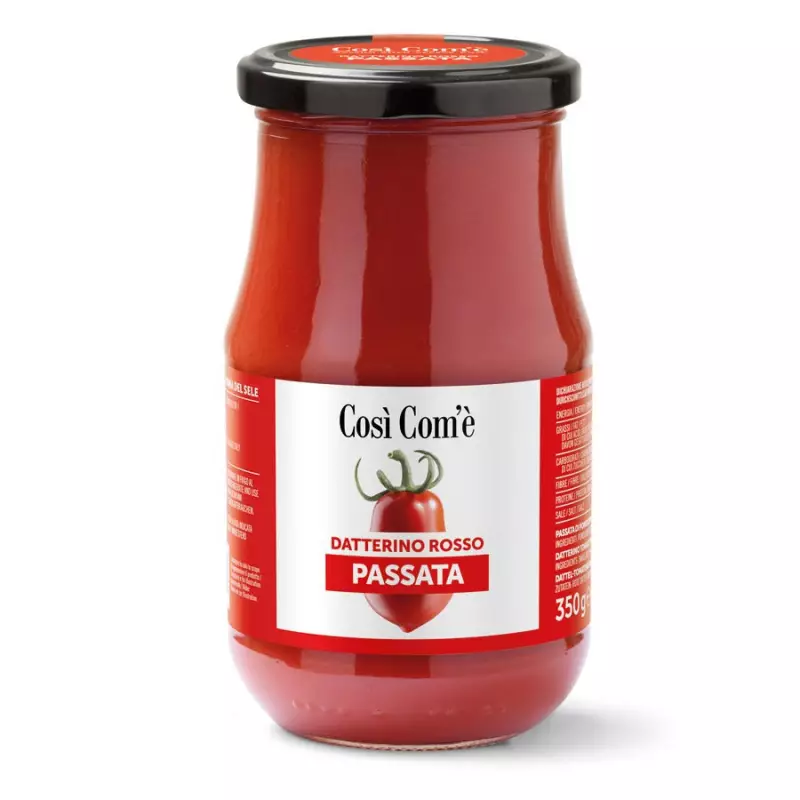 Sweet and creamy, Datterino Rosso tomato puree Così come is distinguished by the fresh and intense taste of freshly picked tomatoes. It can also be consumed without cooking to prepare cold or hot aperitifs, creams and velvety soups. The red date tomato is distinguished from other tomato varieties by its elongated shape that resembles that of a date. It has a high sweetness, almost double that of a classic tomato variety, an intense flavor and an extremely thin skin with a bright red color.