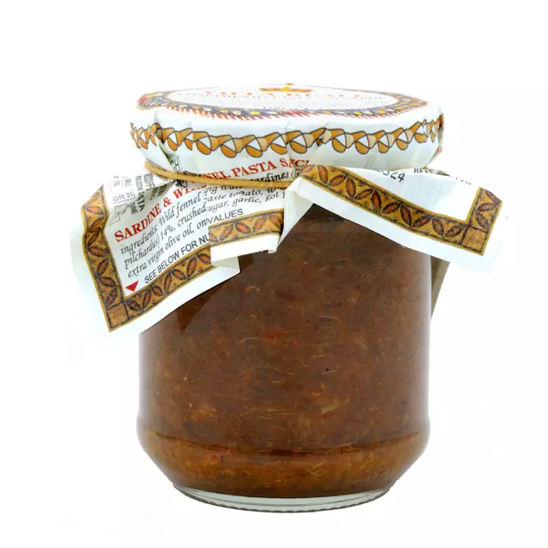 Pasta con le Sarde (Pasta with sardines) is one of the most typical recipes of Sicilian cuisine. Sarde sauce is made with Anchovies, tomato, wild fennel, onion and plump raisins. This ready to use Pasta con Sarde Sauce Villa Reale is prepared according to the traditional recipe and will give you the opportunity to taste at home and in a few minutes a delicious Sicilian typical Pasta. To complete the dish, add a sprinkle of breadcrumbs before serving.