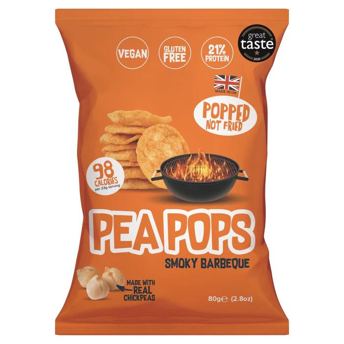 We use all-natural ingredients to produce award-winning snacks that are not only healthy but also taste great. We want to take our delicious crisps to every corner of the world, one pop at a time. Pea Pops are a new delicious, healthy crisp made from chickpeas. Our Smoky BBQ Pea Pops have good notes of smoked spice and a satisfying crunch. Winner of Great Taste Award 2020. Popped, not fried, Pea Pops have 60% less fat than regular fried crisps. Healthy Never Tasted So Good. Vegan Gluten Free. 21% Protein. Popped Not Fried. 98 Calories per 23g serving. Made with Real Chickpeas. High in fiber. No MSG, artificial color or flavoring. 60% less fat than regular fried chips.