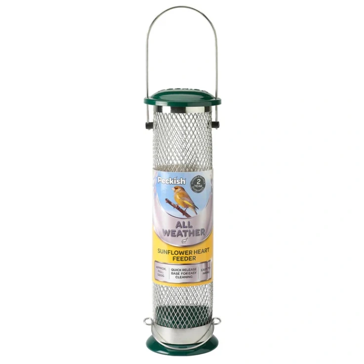 Peckish All Weather Sunflower Heart Feeder is simple and easy to fill and hang. The removable plastic insert included helps to reduce mess when feeding. High quality stainless steel mesh creates many feeding opportunities. Use with peckish sunflower hearts, also suitable for peanuts. Stainless steel. Dimension: 9cm x 9cm x 33.5cm.