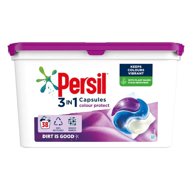 Persil 3 in 1 Colour Laundry Washing Capsules keep colours vibrant wash after wash, These washing capsules are made with plant-based stain removers and biodegradable ingredients – tough on stains, kinder to our planet, Persil 3 in 1 Colour Washing Capsules provide a long lasting fragrance and colour protection, Persil 3 in 1 Colour Washing Capsules revive colour and reduce bobbles* – simply throw in 1-2 capsules (depending on load size), Our 3 in 1 capsules are created to care for your clothes in one convenient pre-measured dose, Our Persil washing capsules come in a 100% recyclable tub