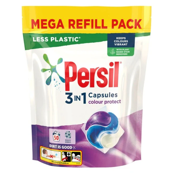Persil 3 in 1 Colour Washing Capsules keep colours vibrant wash after wash, These washing capsules are made with plant-based stain removers and biodegradable ingredients – tough on stains, kinder to our planet, Our 3 in 1 capsules are created to care for your laundry in one convenient pre-measured dose, Persil 3 in 1 Colour Washing Capsules revive colour and reduce bobbles* – simply throw in 1-2 capsules (depending on load size), Easy to use 3 in 1 laundry capsules have an improved resealable pouch, reducing plastic use and caring for our planet, Our mega refill pack contains enough washing capsules for up to 50 washes, perfect for families