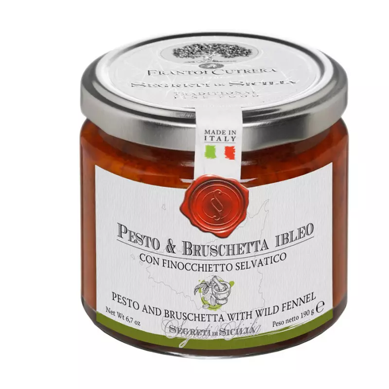 Ibleo Pesto and Bruschetta with Cutrera wild fennel is a typical recipe from south-eastern Sicily. It is a pesto made with dried tomatoes, tomato sauce and Iblean wild fennel. An ideal sauce to bring all the flavor of traditional Sicilian cuisine to the table. Excellent both on bruschetta and for seasoning pasta such as spaghetti, penne and homemade pasta.