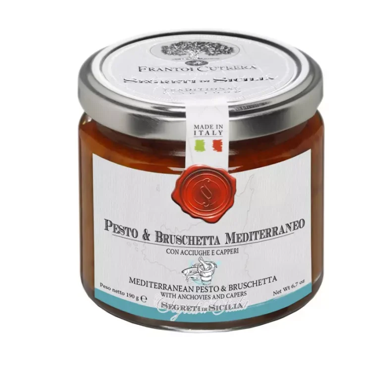 Segreti di Sicilia Mediterranean Pesto and Bruschetta is a pesto made with dried tomatoes, Sicilian anchovies and capers. All the flavor of the Sicilian sea in a delicious ready-to-use sauce. Excellent both on bruschetta and for seasoning pasta such as spaghetti, penne or busiate.