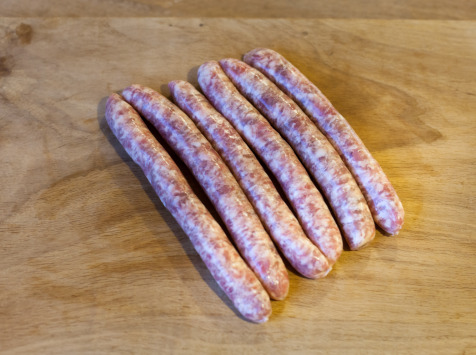 Chipolatas pour barbecue ou purée. Nos porcs naissent et sont élevés à la ferme dans une stabulation paillée : ils ont donc de la place pour se déplacer. Ils sont nourris avec des céréales sans OGM et abattus à l’âge d’environ 8 mois (contre 4 mois pour du porc industriel), ce qui donne une viande plus ferme et plus goûteuse. L’abattoir est situé à 30 minutes de la ferme. Toute notre charcuterie est naturelle : elle est transformée à la ferme avec des recettes à l’ancienne ; tout est salé au sel sec comme autrefois, sans saumure, d’où l’impression, parfois, que le produit est plus salé. Aucun colorant, conservateur, ou additif n’est utilisé dans ce produit. Il ne contient pas de sel nitrité, ce qui explique sa couleur plus « grise », et l’impression qu’elle est plus grasse, alors qu’en réalité, il y a beaucoup moins de gras que dans la charcuterie industrielle ! Ce produit est frais, il peut donc être congelé.