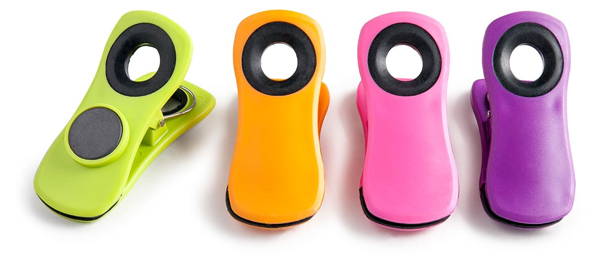 Ces 4 pinces aimantées en plastique et inox sont très pratiques pour fermer hermétiquement des sachets ou des poches pâtissières garnies en attente d’utilisation.
