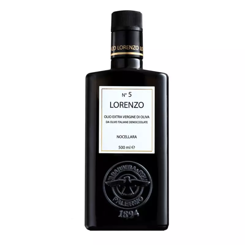 Lorenzo N°5 is a simply unique oil obtained after much intense research: the careful selection of a single olive variety (Nocellara del Belice), the extraction process that gently removes the stone from the olive without harming the pulp, then under careful observation, the pulp is pressed at very low temperatures using an Alfa-Laval mill. The stone removal process eliminates the bitter component of the olive, thereby creating an intensely golden oil of noted creaminess with a delicately spiced aroma.