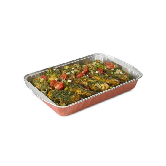 Doté d’un joli design, vous pourrez servir vos préparations culinaires à l’intérieur de ces plats aluminium jetables. En effet, l’aluminium brillant et la teinte cuivrée de ce plat alimentaire met subtilement en valeur vos plats et préparations.