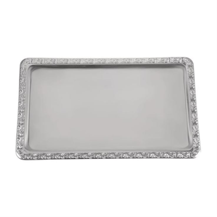 Ajoutez du style et de la finesse à vos présentations alimentaires avec le plateau de service rectangulaire en inox APS. Avec des détails complexes sur les bords et une finition polie, le plateau offre une apparence très élégante, mettant en valeur vos buffets. En acier inoxydable de haute qualité, le plateau est incroyablement robuste et résistant, pour une longue durée de vie. Les bords surélevés empêchent les aliments de glisser lors du transport entre les zones de service.