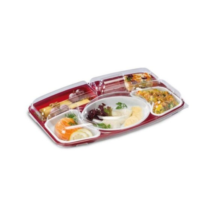 Plateau repas plastique 5 compartiments rouge avec couvercle 41,2 x 25,7 x 3 cm – par 15