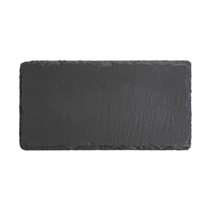 Plateaux de présentation contemporains en ardoise GN 1/3, pour contact alimentaire, Olympia. Ils sont recouverts de vernis transparent pour une imperméabilité à l’eau, l’huile et autres liquides. Les bords dentelés naturels apportent à la présentation des aliments tels que sushis et tapas une touche d’élégance supplémentaire.