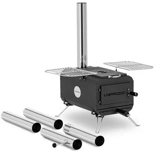 La sécurité est également assurée. La livraison comprend 5 tuyaux de cheminée. Vous les installez en un tour de main et évacuez ainsi les gaz de fumée de manière fiable. De plus, le poêle à bois pour tente dispose d’un pare-étincelles. Uniprodo mise sur une excellente finition et des matériaux résistants à la chaleur. Ce poêle à bois est fabriqué en acier au carbone durable. Un matériau qui est résistant à la corrosion et conduit très bien la chaleur. Un scellement de haute qualité vous permet de profiter d’une chaleur confortable sans fumée. La densité du matériau du poêle est de 1,2 mm. Le tuyau de cheminée est composé d’un matériau de 0,4 mm d’épaisseur.