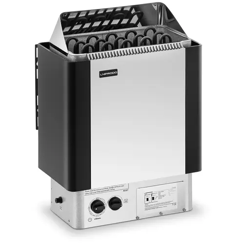 Le poêle peut accueillir jusqu’à 10 kg de pierres dans le compartiment prévu à cet effet– les pierres UNI_SAUNA_S01 d’Uniprodo sont d’ailleurs tout indiquées. Tout comme le boîtier de l’appareil, le compartiment à pierres est fait d’un alliage d’aluminium et de zinc résistant à la corrosion. La tôle conduisant l’air et le cache sont quant à eux en inox poli. Les résistances sont elles aussi protégées contre la corrosion et ne risquent pas de rouiller. Afin de garantir une utilisation sure, le poêle pour sauna est de plus équipé d’un protecteur thermique s’activant à partir de 115 °C.
