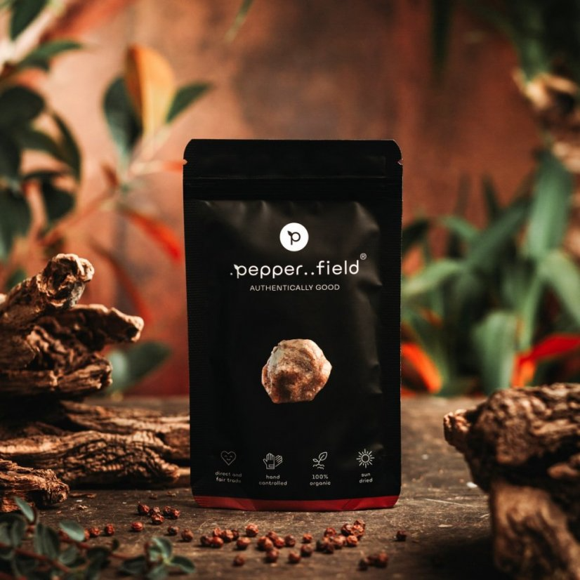 À l’intérieur d’un sachet refermable qui conserve parfaitement tout le caractère de son contenu, vous trouverez des grains du poivre rouge des plantations de Kampot. Ils sont récoltés à pleine maturité au plus fort de la saison du poivre, et sont ainsi riches en fructose avec des arômes intensément fruités. Après la récolte, les grains sont séchés au soleil, donnant à la peau rouge du poivre sa texture aride si caractéristique.