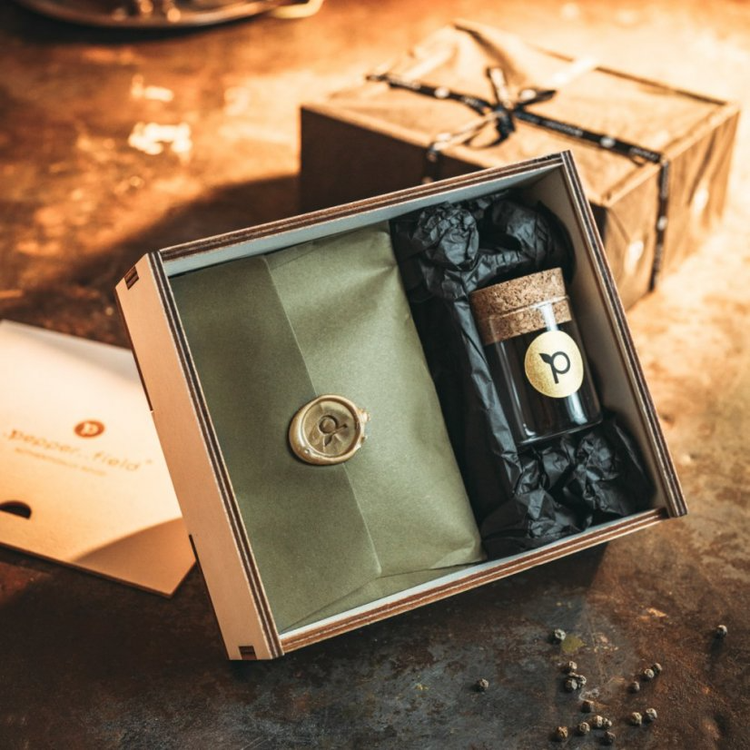 Poivre vert de Kampot frais en saumure dans un coffret cadeau avec son pot en verre