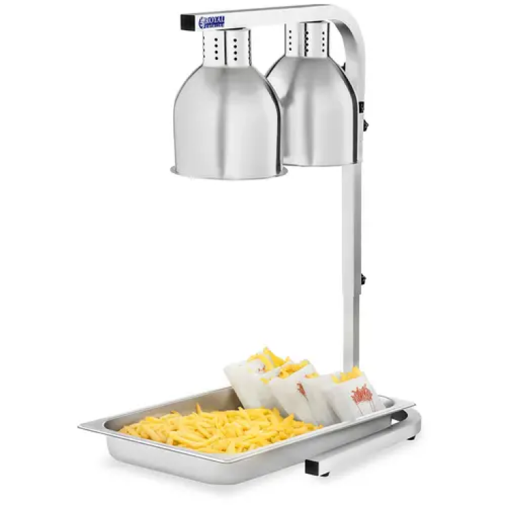 Le bras de la lampe est réglable en hauteur simplement et rapidement entre 600 et 796 mm. La température peut être ajustée entre 40 et 70 °C. Cela vous offre deux possibilités d’utilisation. Vous décidez vous-même si vous souhaitez réchauffer de manière constante ou en peu de temps vos plats. Les abat-jours sont perforés pour permettre aux ampoules de refroidir et ainsi, de rallonger leur longévité.