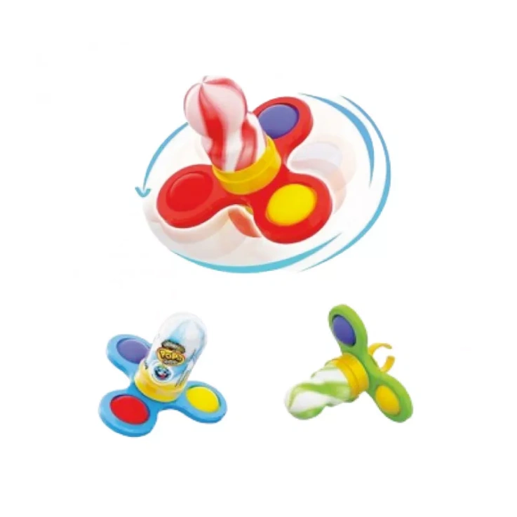 JOHNY BEE – Sucette en forme de toupie, avec des pop it intégrés (célèbre jeu de bulles colorées en silicone dont le but est de les exploser), le tout sur un anneau pour porter la sucette en bague vendu en gros conditionnement, dans un présentoir de 16 pcs