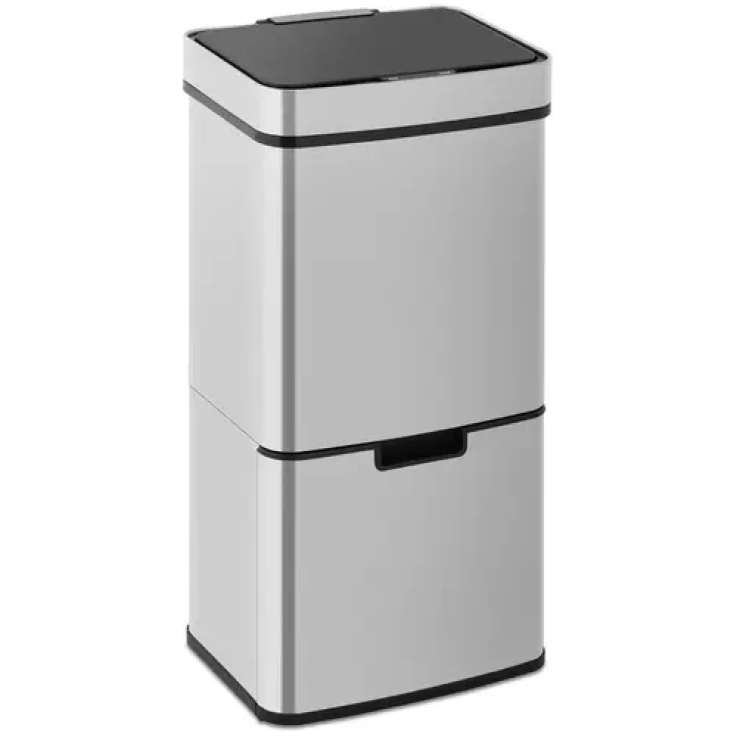 Cette poubelle de 72 l est équipée d’un récipient supérieur qui s’ouvre automatiquement et de deux récipients inférieurs amovibles. Le récipient supérieur a une capacité de 47 l et on peut y accrocher un sac poubelle à l’aide d’un dispositif de fixation. Afin d’extraire le sac avec aisance, vous pouvez ouvrir et fermer le couvercle plus longtemps en appuyant sur un bouton. Un compartiment coulissant contenant deux récipients en plastique se situe au niveau du sol. Ces derniers ont une capacité combinée de 25 l et peuvent être retirés à l’aide d’une poignée. La division tripartite de cette poubelle automatique en fait un accessoire idéal pour le tri des déchets !