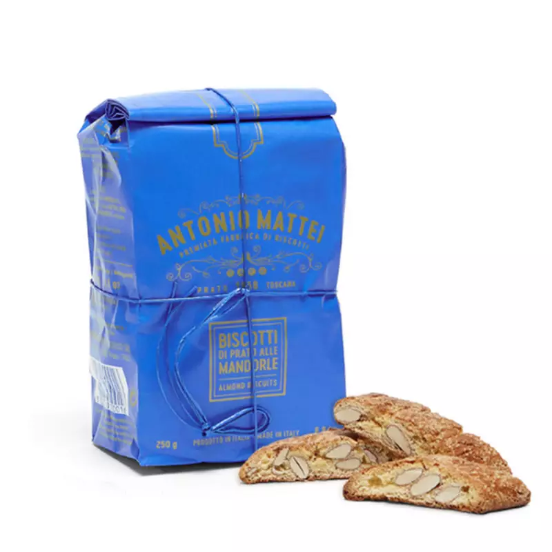 Since 1858 Antonio Mattei Biscuits Cantucci have been baked daily in the same rooms of the historic bakery and packed by hand in the classic and iconic Mattei Blue Bag.