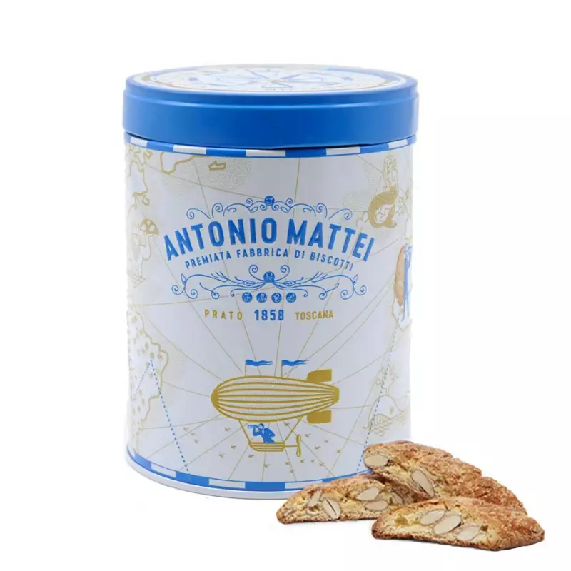 Amerigo tin biscuit box with almond biscuits from Prato by Antonio Mattei embodies all the tradition and craftsmanship of this historic Tuscan biscuit factory thanks to its historical graphics and colours. It contains 125 grams of Almond Prato Biscuits, which, also known as cantuccini or cantucci, are part of the Tuscan confectionery tradition and are usually paired with the typical Vin Santo wine at the end of a meal.