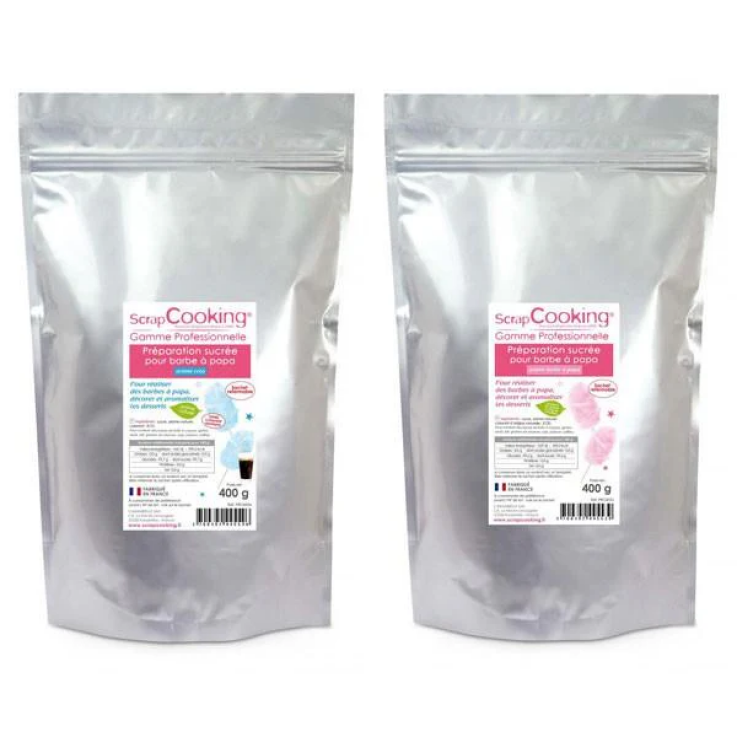 Réalisez vos propres barbes à papa grâce à ces 2 sachets (bleu et rose) de préparation sucrée de format professionnel (400 g/ sachet).