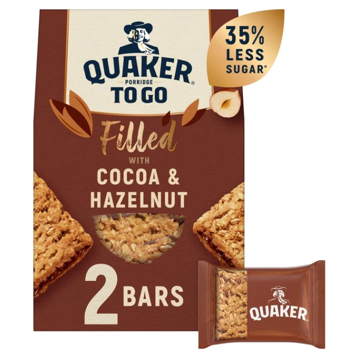 Delicious oaty breakfast bars made with 100% wholegrain Quaker oats and filled with a delicious cocoa and hazelnut center. This pack contains 2 servings. The same amount of oats as a bowl of Oat So Simple porridge. 100% Whole Grain Oats, High in Fiber, Great Taste Guaranteed. Suitable for Vegetarians.