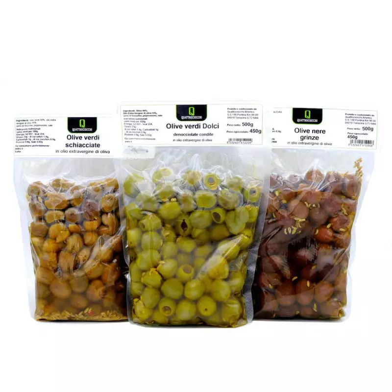 Quattrociocchi Olives Trio: Crushed Olives, Pitted Green Olives and Dried Black Olives in Olive Oil 500 gr x 3