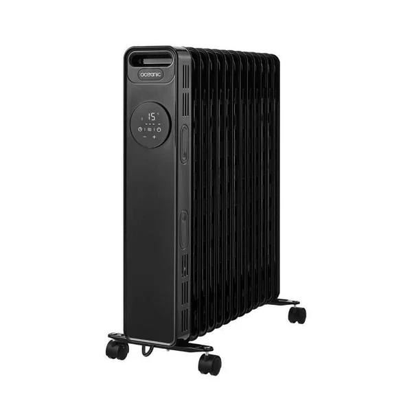 Oceanic Radiateur électrique d’appoint bain d’huile – 13 éléments – 3 puissances de chauffe : 1000W – 1500W – 2500W – Thermostat électronique – Ecran a affichage LED – Minuterie jusqu’a 24H – Télécommande – Poignée de transport intégrée – Enrouleur de câble intégré – Témoin lumineux de fonctionnement – Coupure sécurité anti-renversement et anti-surchauffe