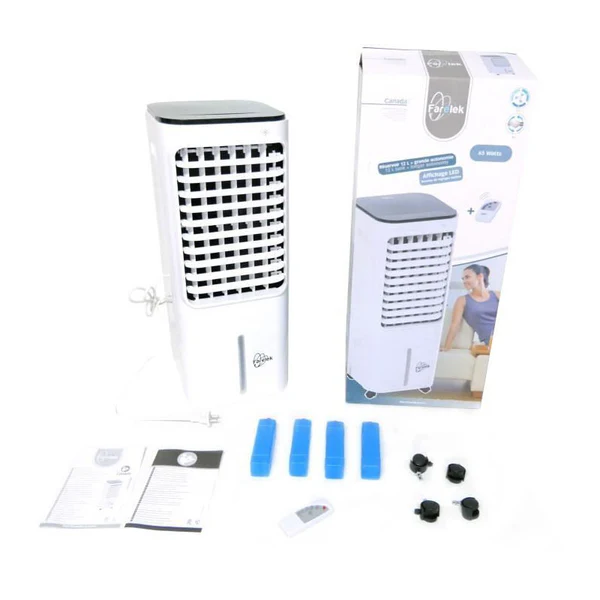 Description produit – Rafraichisseur D’air – Farelek – 112201 – 3 Vitesses – 7,5 H – 12 L – Blanc Farelek
