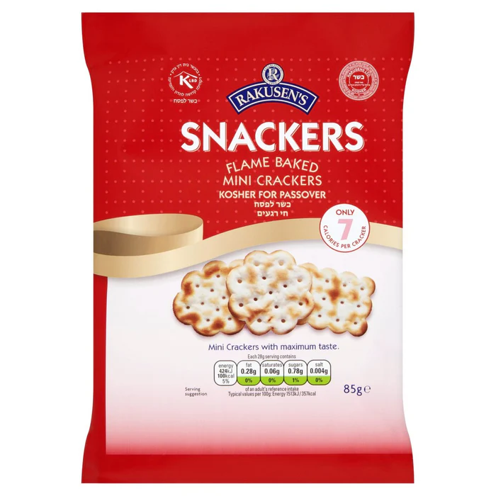 Rakusen’s Snackers are certified as kosher for Passover by the London Beth Din and the ecclesiastical authorities listed on the seal. The Snackers are produced to the most stringent standards to meet the requirements of religious law and modern food hygiene regulations. Only 7 calories per cracker, Mini Crackers with maximum taste, Low in fat, sugar and salt, Dairy, lactose and nut free, Vegetarian Society approved, Suitable for vegans, Kosher – KLBD