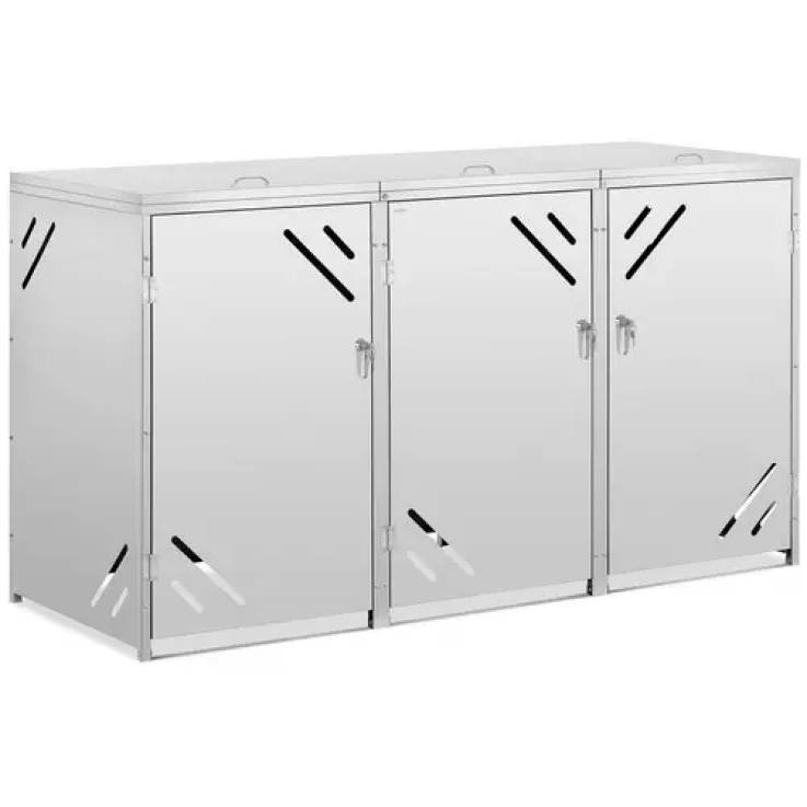 Ce range-poubelle est fait d’acier inoxydable robuste, matĆ©riau gage de sĆ©curitĆ© mĆŖme Ć l’extĆ©rieur. L’inox est non seulement rĆ©sistant aux intempĆ©ries, mais aussi trĆØs facile d’entretien, ce qui aide Ć le garder propre. Des fentes de ventilation diagonales garantissent une circulation d’air optimale pour favoriser le maintien d’une bonne hygiĆØne. Comme ce modĆØle met Ć disposition un maximum de trois compartiments, le tri sĆ©lectif est possible sans problĆØme. L’abri convient tant aux poubelles Ć dĆ©chets organiques qu’aux conteneurs Ć ordures mĆ©nagĆØres ou Ć papier ā Ć vous de choisir l’usage que vous en ferez.