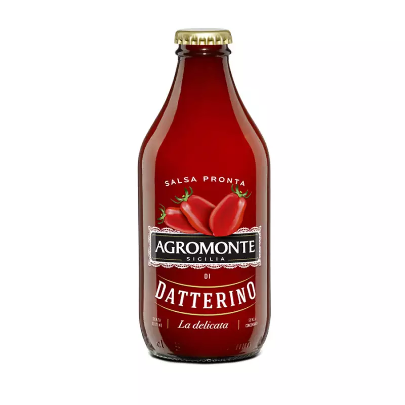 This Agromonte Ready-to-use Datterino tomato sauce contains 97% Datterino tomato, characterized by its very sweet and delicate taste. Datterini tomatoes are grown in greenhouses with natural methods, harvested by hand and then processed with simple and genuine procedures, according to the Sicilian tradition. The result is a sweet and creamy sauce seasoned with basil, carrots, onions, celery, extra virgin olive oil, salt and sugar.