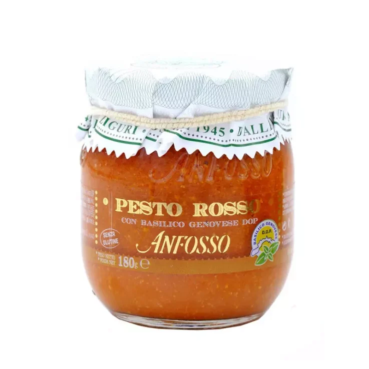 Red Pesto with Basil Genovese PDO is a valid alternative to the traditional Pesto Genovese. It is ideal as condiment for Pasta but also to be spread on bread and bruschetta for an original and mediterranean appetizer.
