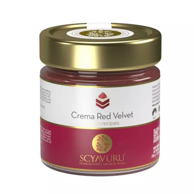 The Red Velvet Scyavuru Cream proposes in a spreadable version the unique taste of the famous American cake made up of layers of bright red sponge cake interspersed with a white cheese frosting. The velvety texture of the cream combines with the softness of the sponge cake grains for an enveloping and irresistible taste. Try it to fill cakes or to garnish ice cream, panna cotta or cheesecake in order to recreate the chromatic contrast between red and white typical of the American Red Velvet cake.