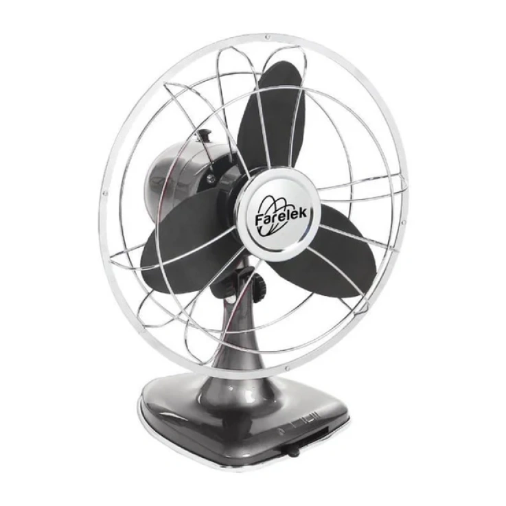Ventilateur a poser diametre 30cm, puissance 30W, 3 vitesses avec sélecteur de vitesse a l’avant du pied, oscillant +/- 55°, inclinaison réglable, design rétro indus qui s’integre parfaitement dans les intérieurs de ce style, couleur anthracite (pied et bloc moteur) et chrome (grille de protection), 3 pales en mousse noire pour une sécurité totale d’utilisation. Grille de protection métallique avec poignée de transpo
