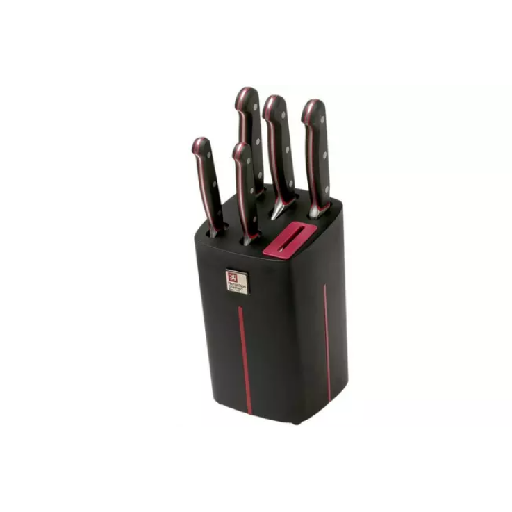 2 Cet ensemble de 5 couteaux Richardson Sheffield Velocity comprenant un bloc de couteaux comprend un couteau d’office, un couteau utilitaire, un couteau de chef, un couteau à découper et un couteau à pain. Cet ensemble de couteaux est un excellent exemple du design unique et innovant pour lequel Richardson Sheffield est célèbre. Le bloc est notamment doté d’un aiguiseur de couteaux intégré.