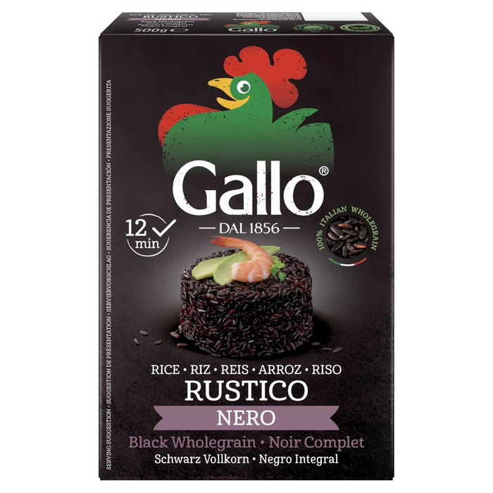 Riso Gallo guarantees the origin of its black rice from Italian rice fields and the quality of its grains, which in size and aroma represent an Italian excellence. Gallo Nero derives from certified seeds, to guarantee the authenticity of the final product to the consumer. Gallo Nero was born and grows in Italian rice fields. It is processed and packaged by Riso Gallo in Lomellina, for a 100% made in Italy rice. 12 min, 100% Italian Wholegrain, Suitable for Vegans. Suitable for Vegetarians.