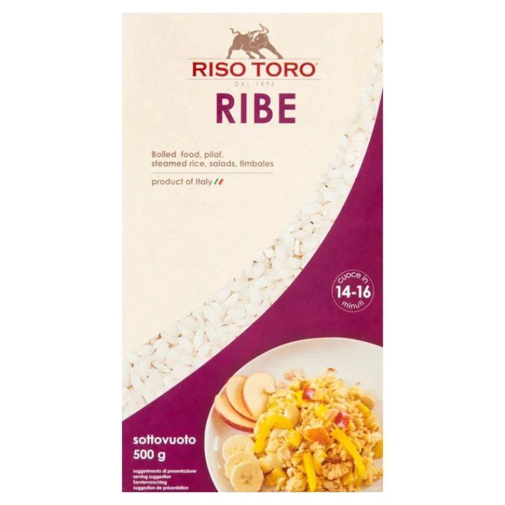 Ribe rice has medium-size, medium-long and rounded grains. This rice type is suitable for being used in wet dishes, such as stocks, rice and vegetable soups, and vegetable minestrones with rice. It is so versatile in the kitchen that it is suitable both for refined dishes – such as boiled, pilaf or steamed rice – and for easier recipes, such as salads and timbales. Boiled food, pilaf, steamed rice, salads, timbales, cooking time 14-16 min.