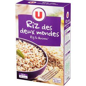 Riz des deux mondes U étui 400g Riz basmati 60%, quinoa blanc 20%, quinoa rouge 20%. Les ingrédients ne proviennent pas de France. Traces éventuelles de céréales contenant du gluten et du soja.