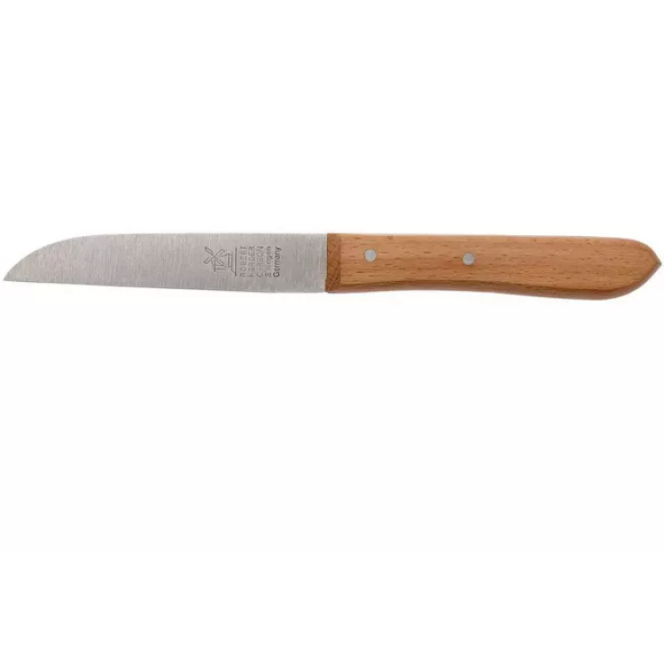 Le couteau à éplucher droit classique de Robert Herder suit les traces des célèbres couteaux de moulin de Robert Herder. Ce couteau à éplucher est idéal pour éplucher les fruits et légumes. Il peut également être utilisé pour divers autres petits travaux de coupe. La lame en acier au carbone est affûtée à la main selon le principe traditionnel allemand « Solinger Dünnschliff ». Le résultat est un couteau tranchant comme un rasoir. L’acier au carbone utilisé pour la lame n’est pas inoxydable, il doit donc être traité avec soin. Cela signifie qu’il doit être nettoyé et séché à la main après utilisation. Le manche est en bois de hêtre rouge, parfaitement fixé à la lame par trois rivets.