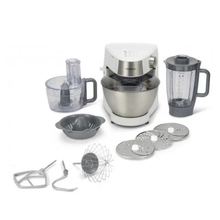 Accessoire(s) inclus : Bol inox 4.3 L, Kit pâtisserie en métal (pétrin, fouet, batteur K), Bol multifonction 1.4 L avec couteaux et 3 disques, Presse-agrumes, Blender 1.5 L
