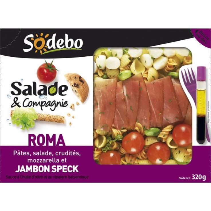 DLC minimum garantie: 5 jours – Pâtes, Salade, crudités, mozzarella et jambon Speck sauce à l’huile d’olive et au vinaigre balsamique.