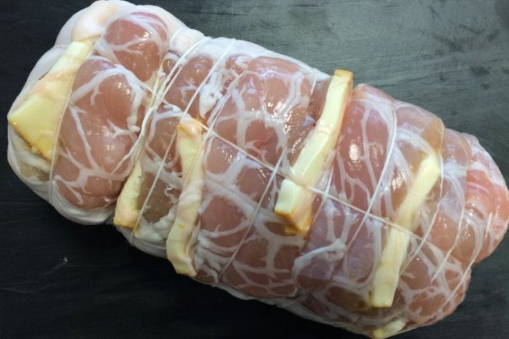 Préparation de filet de dinde, de fromage à raclette et de bacon fumé.