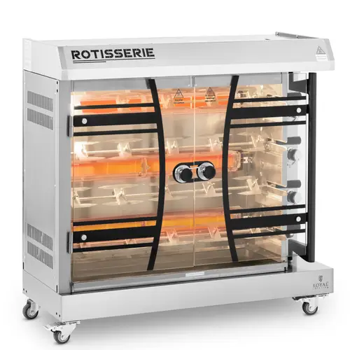 Avec cette rôtissoire professionnelle de Royal Catering, tout le monde sera rassasié! Proposez à votre clientèle de savoureux poulets, porchetta, rosbifs et rôtis à la broche et bien d’autres délices encore, fraîchement préparés et croustillants. Sur quatre broches rotatives pouvant accueillir chacune 4 poulets, vous préparez les spécialités de votre choix, uniformément tendres et avec une peau croustillante. Pour cela, vous pouvez allumer ou éteindre les zones de cuisson indépendamment l’une de l’autre, de sorte que vous pouvez même préparer différents plats en parallèle et ravir vos clients avec une offre variée.