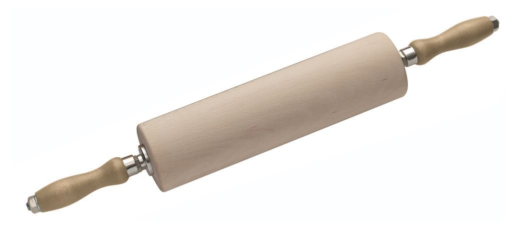 Rouleau à poignées sur roulement à billes. Fabrication très robuste pour utilisation intensive. Rouleau hêtre Ø 8 cm. Poignées hêtre. Monture inox.