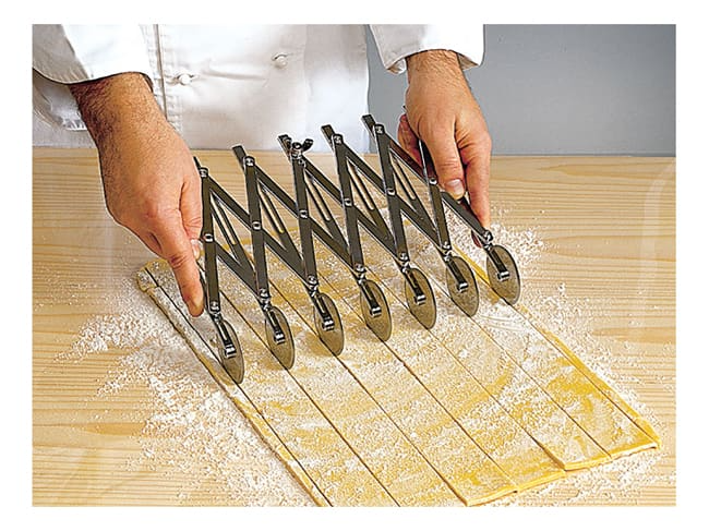 Rouleau en inox équipé de 7 lames lisses, très utile pour la découpe des pâtes en plusieurs bandes régulières. Largeur de découpe réglable.